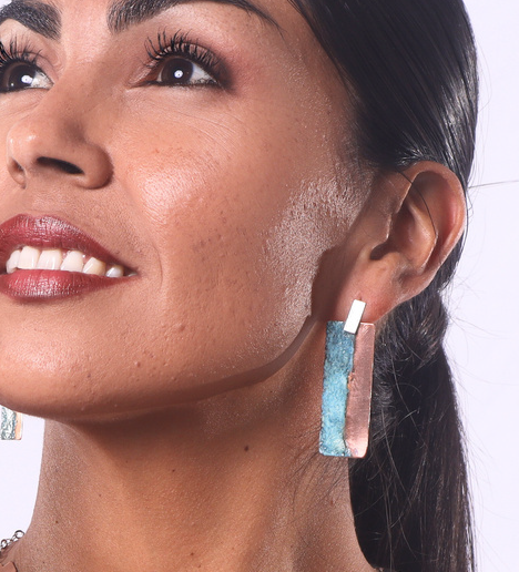 MODERNOS AROS COLGANTES CON UN DISEÑO RECTANGULAR DIVIDIDO, PRESENTANDO UNA SECCIÓN EN COBRE NATURAL Y OTRA CON UNA SUPERFICIE TEXTURIZADA EN TONOS TURQUESA, SIMBOLIZANDO LA UNIÓN DE ELEMENTOS CONTRASTANTES.