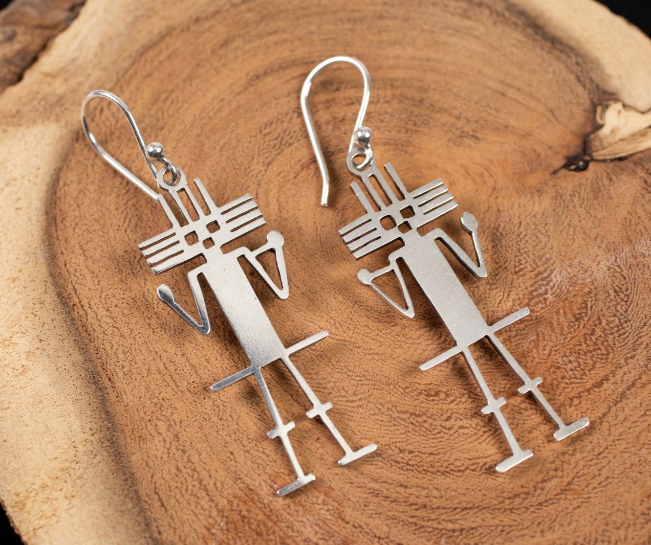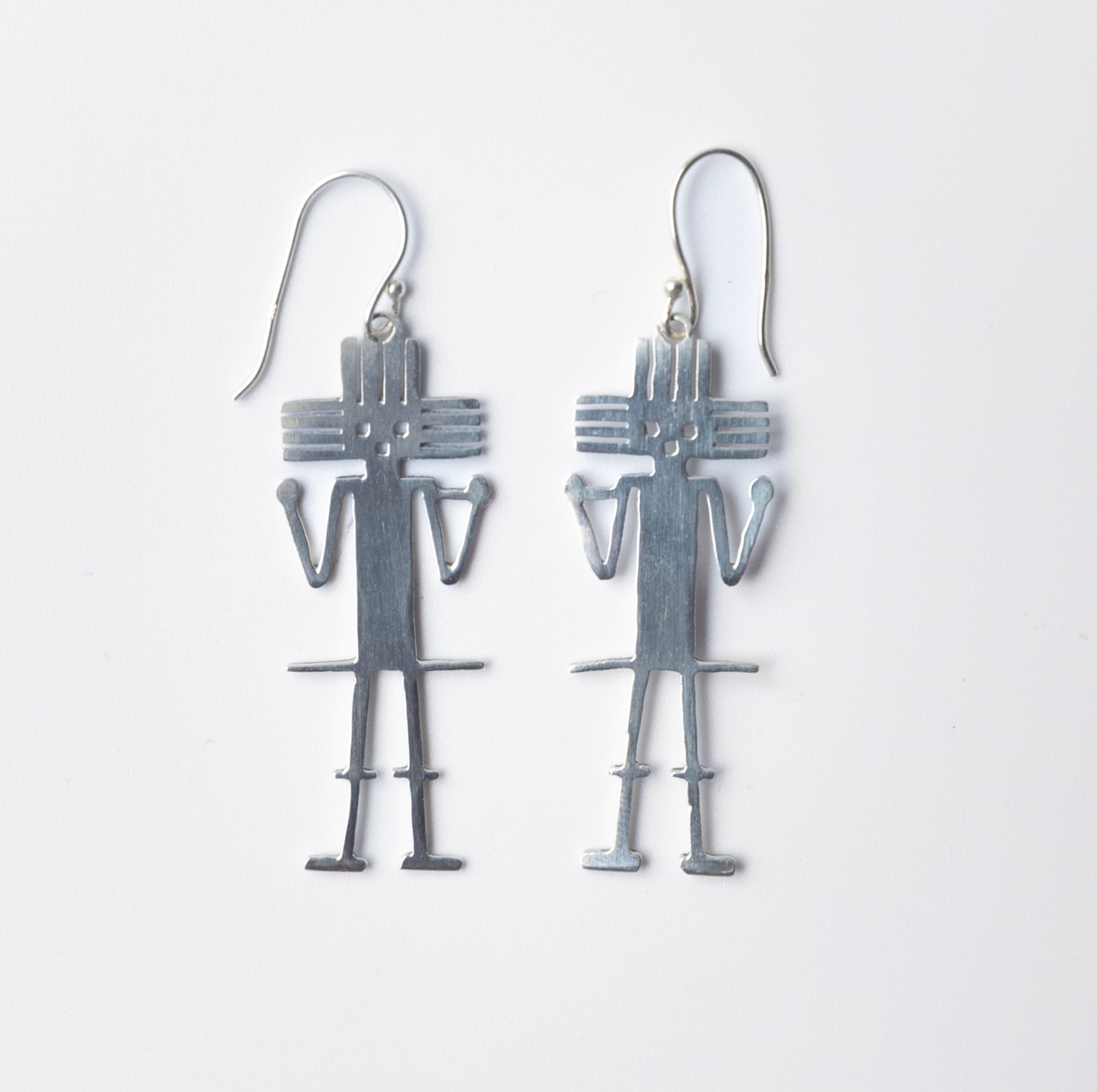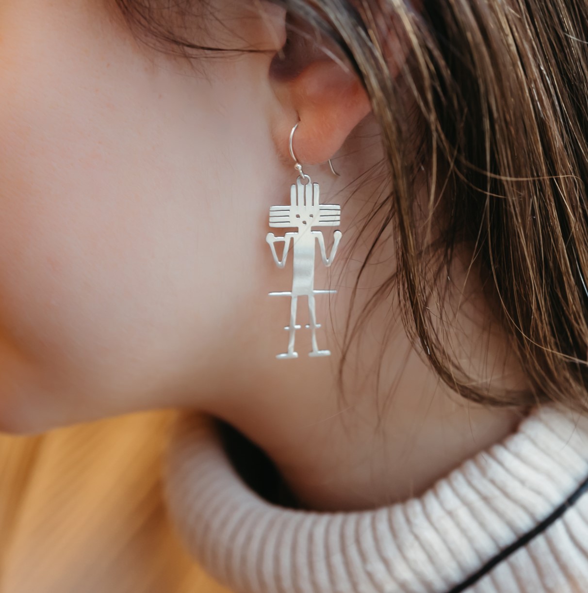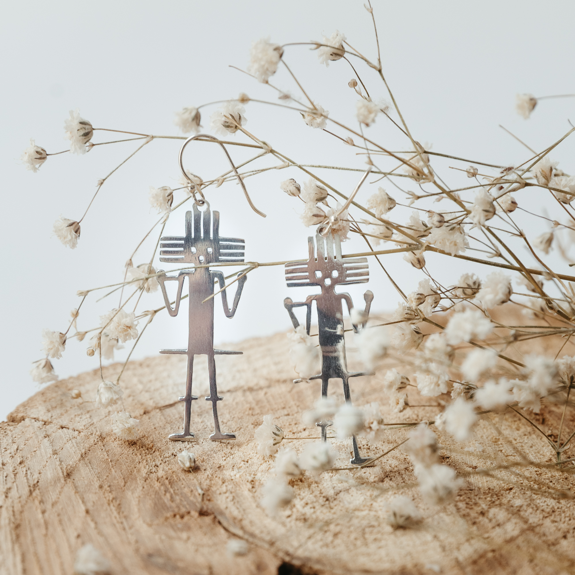 ELEGANTES AROS DE PLATA QUE REPRESENTAN UNA FIGURA DEL GIGANTE DE TARAPACA ESTILIZADA EN MOVIMIENTO, TRANSMITIENDO UNA SENSACIÓN DE LIGEREZA Y DINAMISMO.