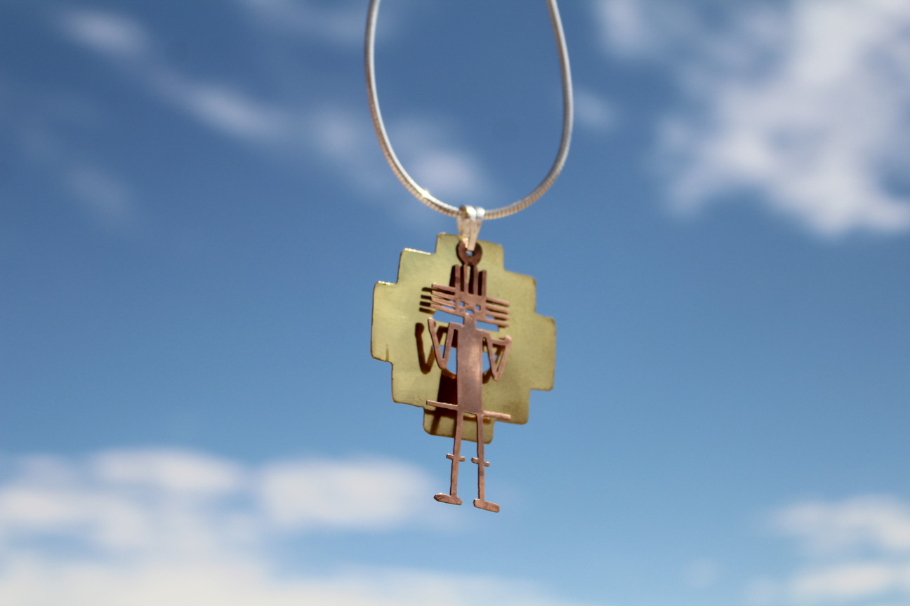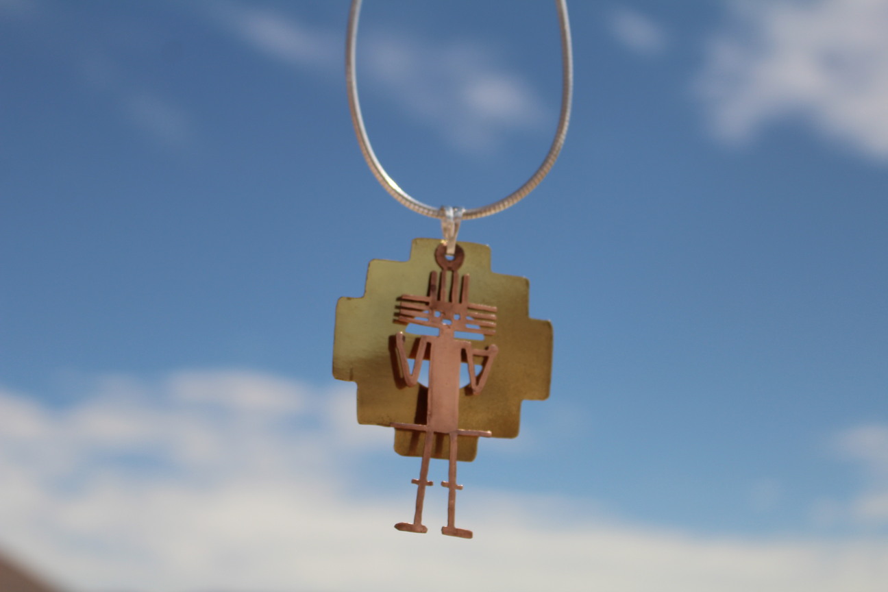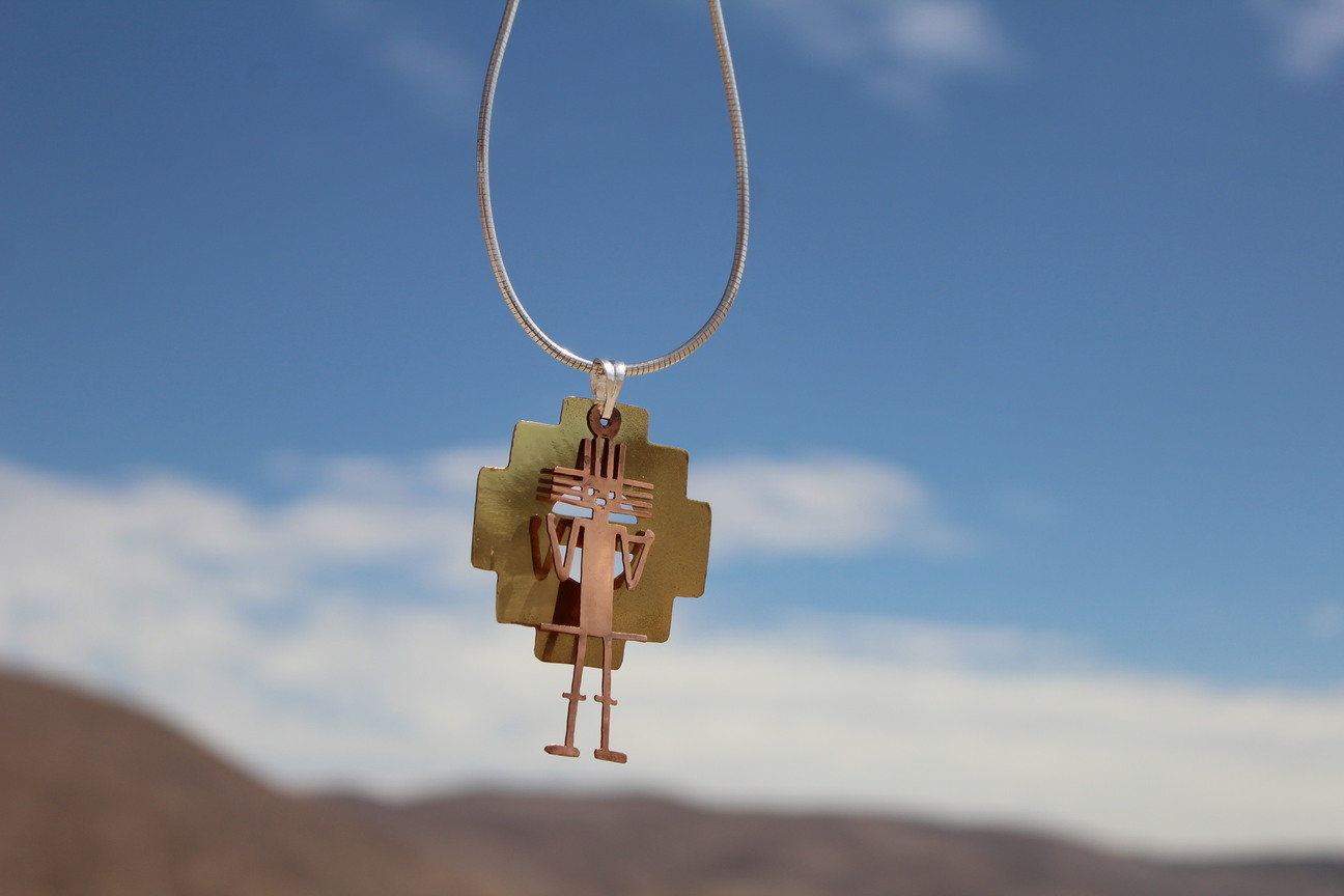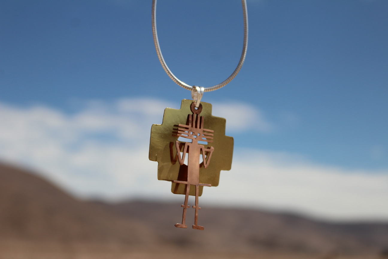 IMPONENTE COLLAR CON UN COLGANTE QUE FUSIONA UNA FIGURA ANTROPOMORFA ESTILIZADA EN COBRE SOBRE UN DISEÑO ESCALONADO TAMBIÉN EN COBRE. EVOCA LA FUERZA Y EL MISTERIO DE CULTURAS ANCESTRALES.