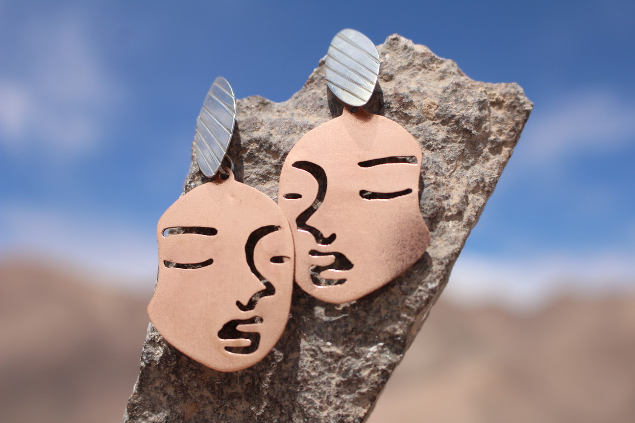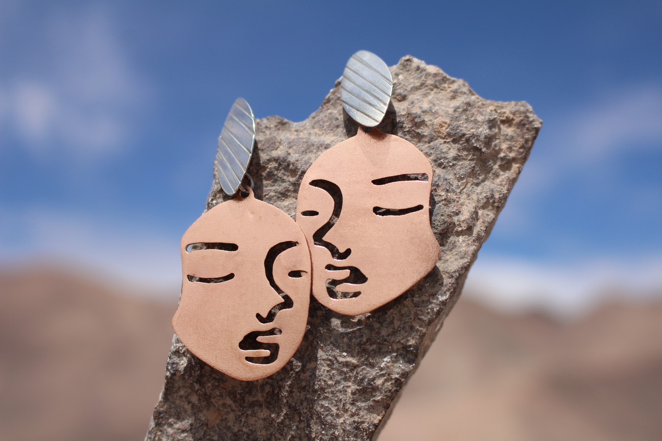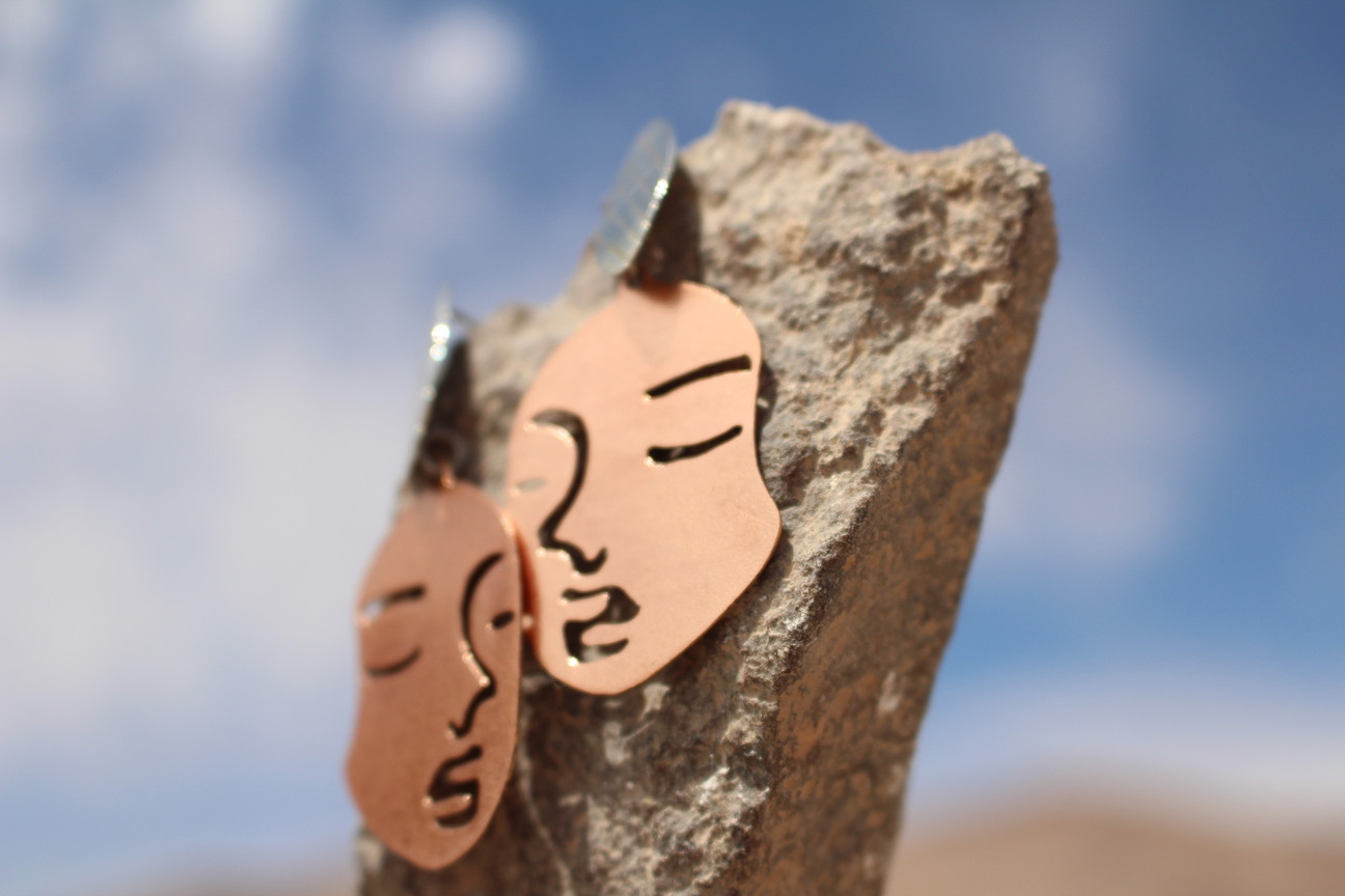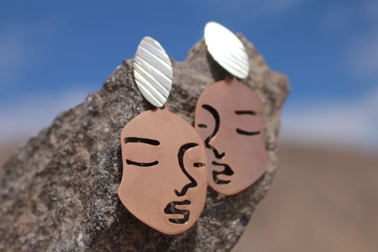 PENDIENTES ARTISTICOS CON UN ROSTRO ABSTRACTO EN METAL Y UN CIRCULO DE MADERA NATURAL, IDEALES PARA UN LOOK BOHEMIO-CHIC O MINIMALISTA.